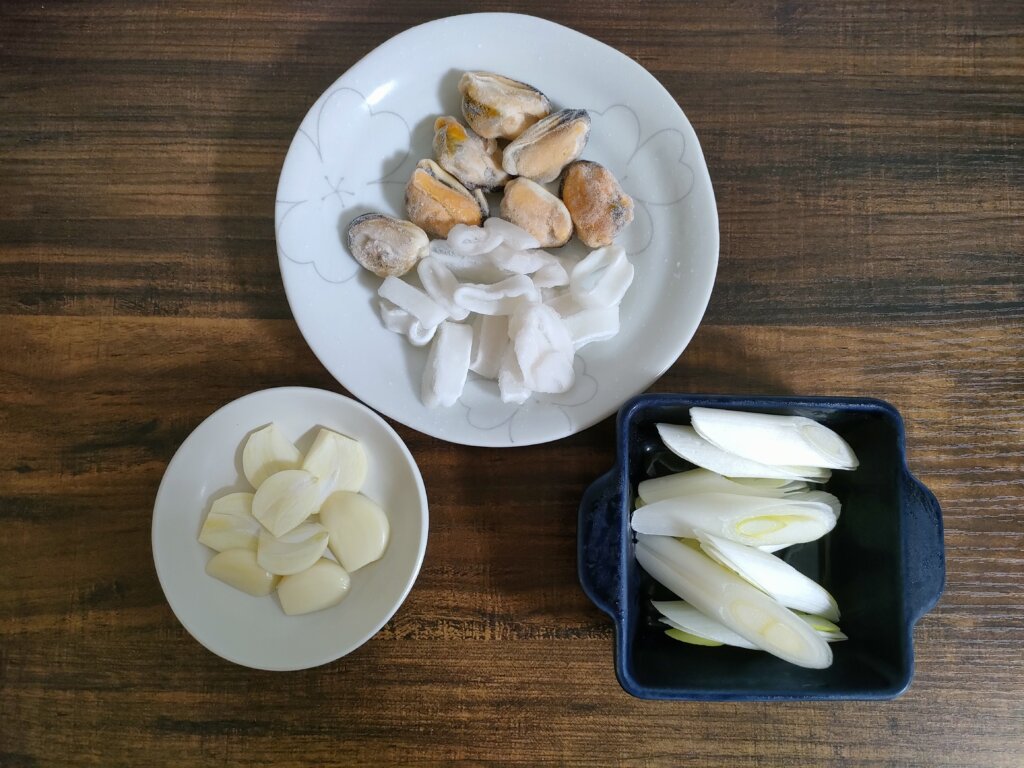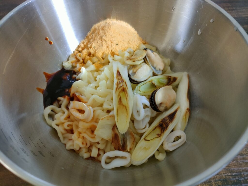 ゆであがった麺と先ほど炒めたニンニク・長ネギ・イカ、茹でたムール貝をボールに入れて調味料と混ぜ合わせます。