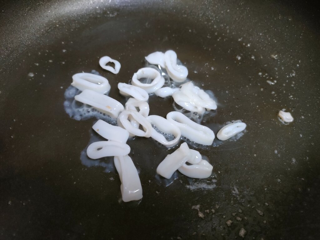 次に長ネギとニンニクの香りが移ったそのままのフライパンでイカを炒めていきます。