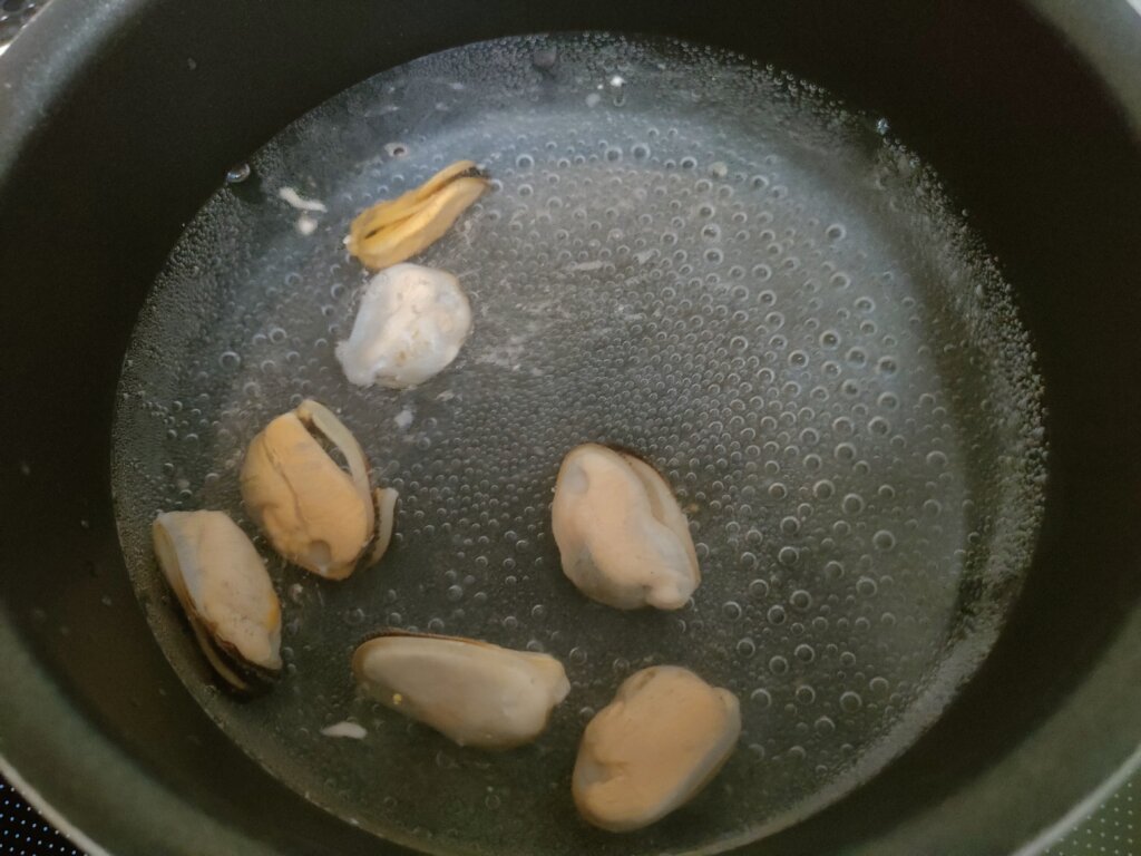 550mlのお湯にムール貝を入れて茹でます。