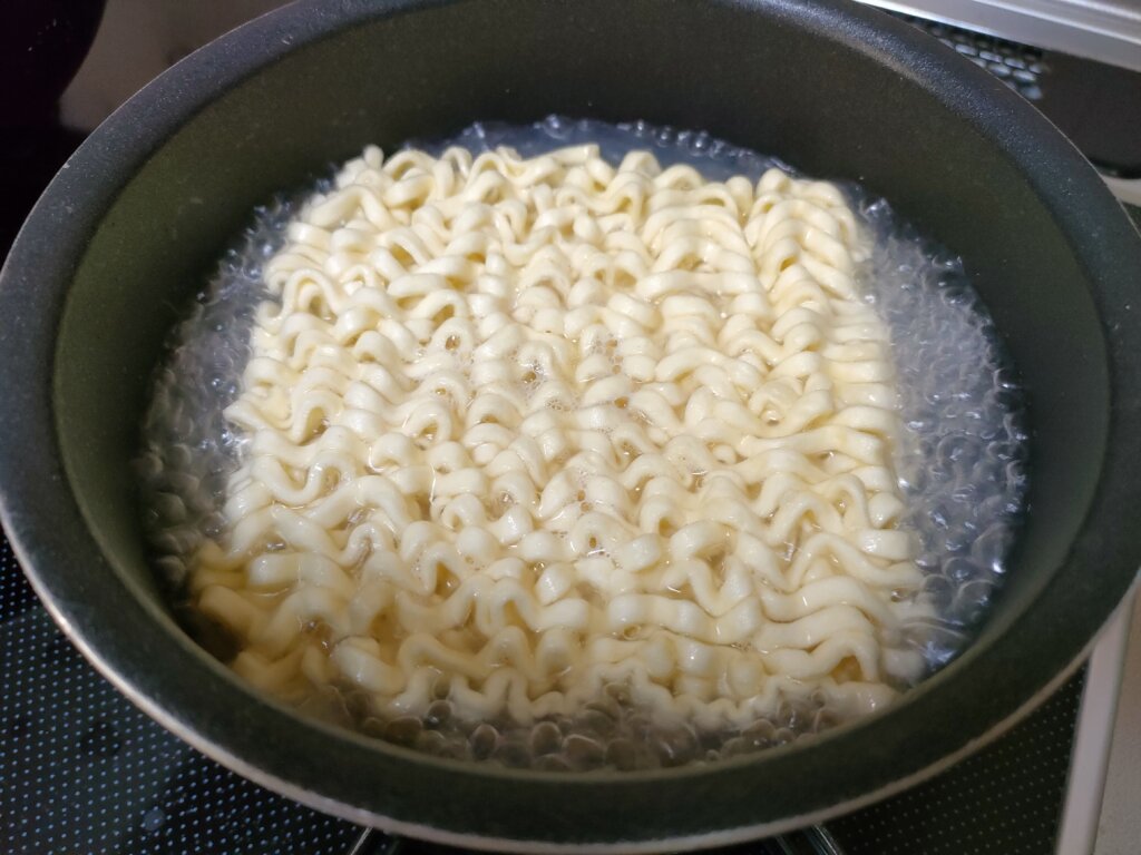 次にお湯を捨てずにそのまま同じ鍋で麺を5分茹でます。
