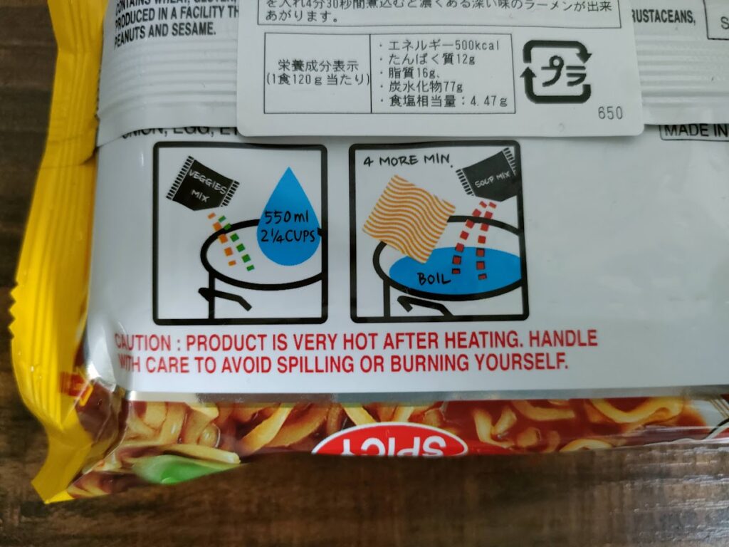 550mlの水にかやくを入れて、沸騰したら麺と粉末スープを入れて4分加熱するだけです。