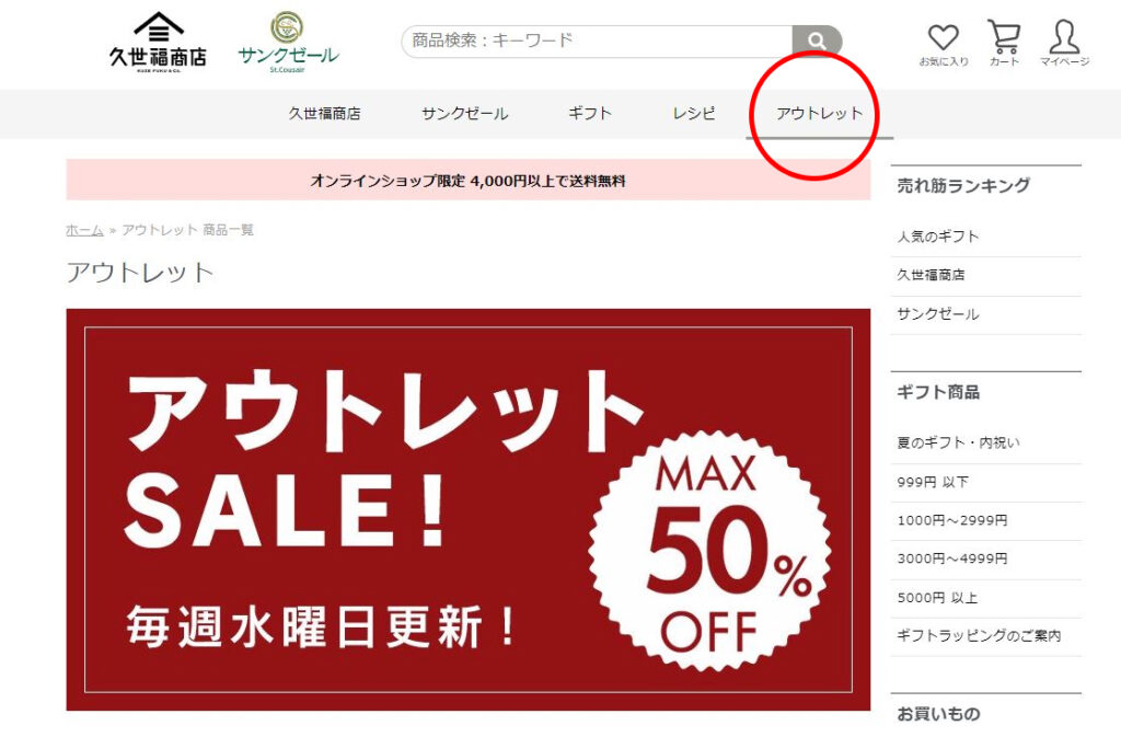 公式の久世福オンラインショップではアウトレット商品の販売も行っています。