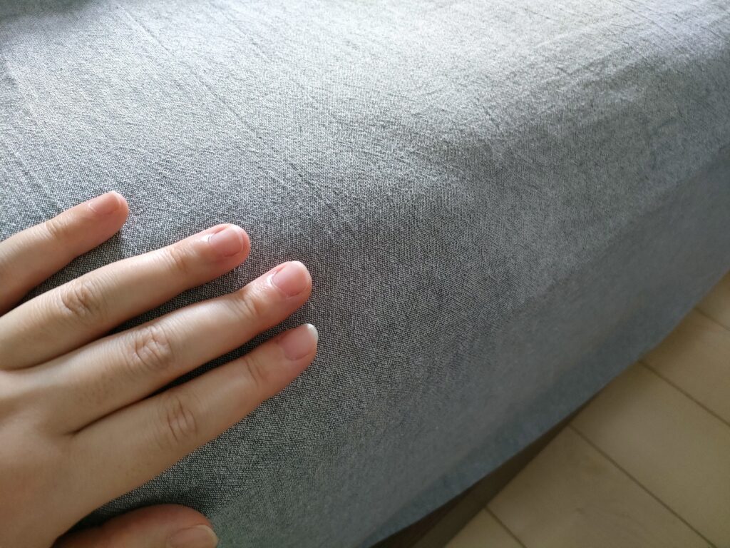 また、ボックスシーツは肌には直接触れないので、Nクールシリーズは正直要らない・・かも。私が購入したコットンウォッシュ素材のすっぽりシーツはざらっとしたヘルシーな質感で色味もベッドフレームとマッチしてて気に入ってます。