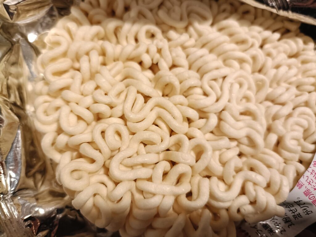 袋を開けると、一般的なインスタント麺よりも明らかに太くて、強いうねりのある麺が登場。茹でる前から「絶対モチモチしてる!」と確信できるビジュアルです。