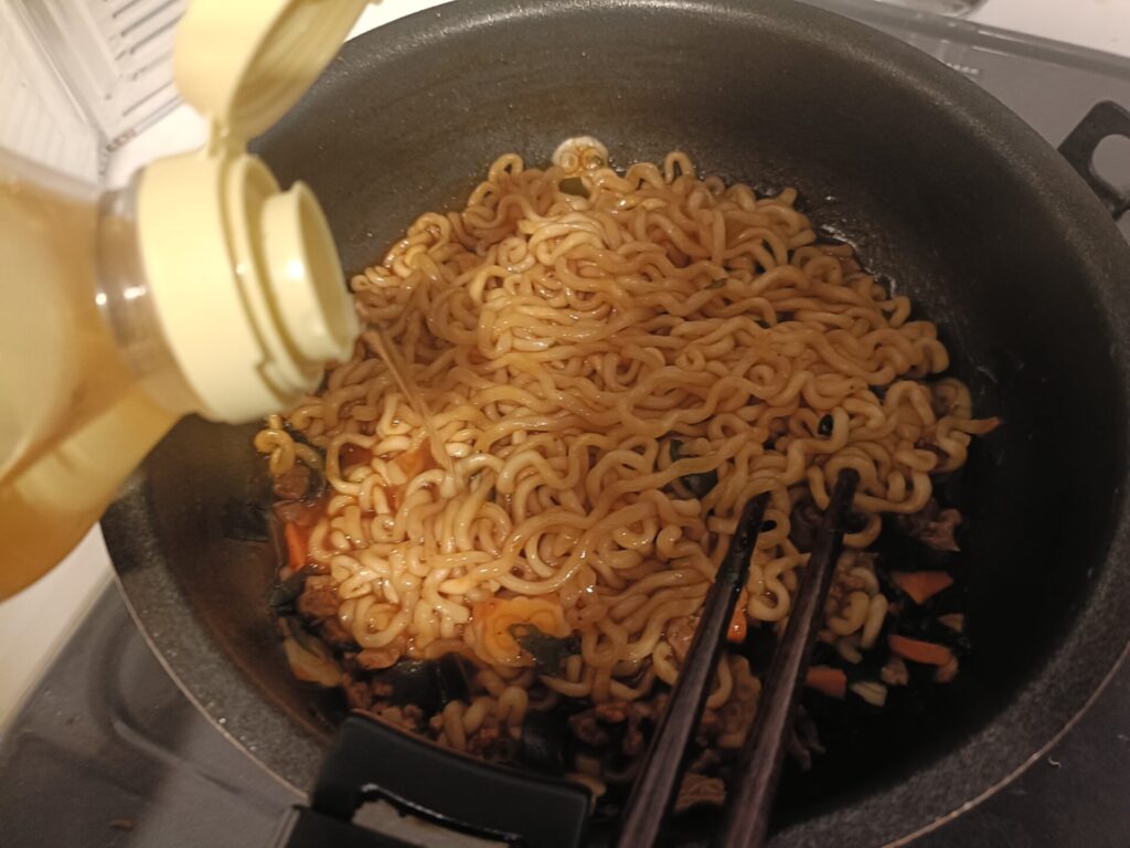 作り方はフライパン一つで完結。お湯を沸かして麺を茹で、最後に粉末スープと調味油を絡めて炒めるスタイルです。