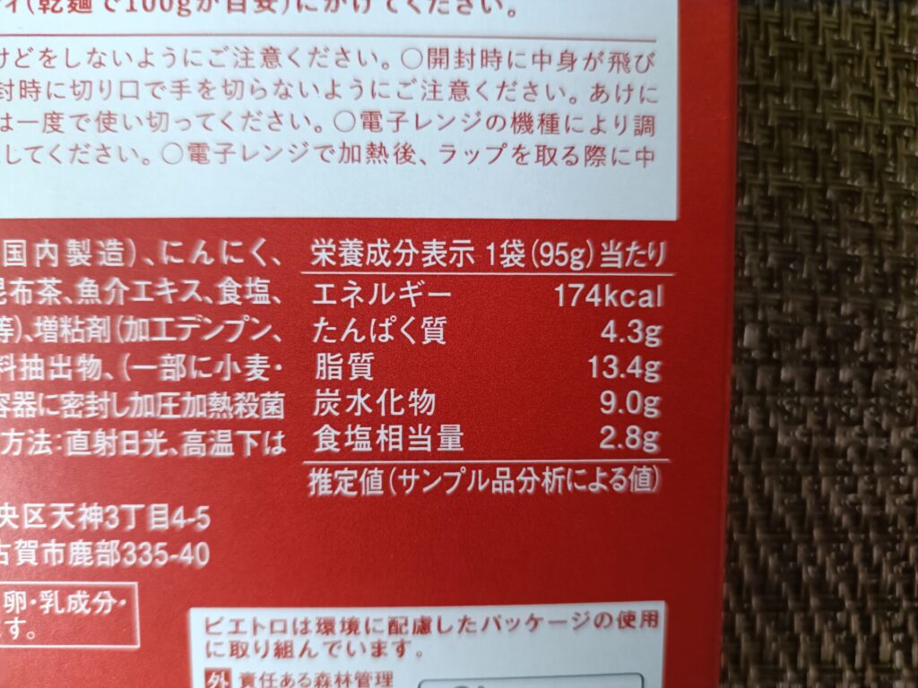 | 具材 | 香味食用油(国内製造)、にんにく、辛子明太子、フライドガーリック、魚醤加工品、昆布茶、魚介エキス、食塩、風味調味料(かつお)、香辛料/調味料(アミノ酸等)、増粘剤(加工デンプン、キサンタンガム)、着色料(紅麹)、香料、香辛料抽出物、(一部に小麦・大豆・魚醤(魚介類)を含む) |