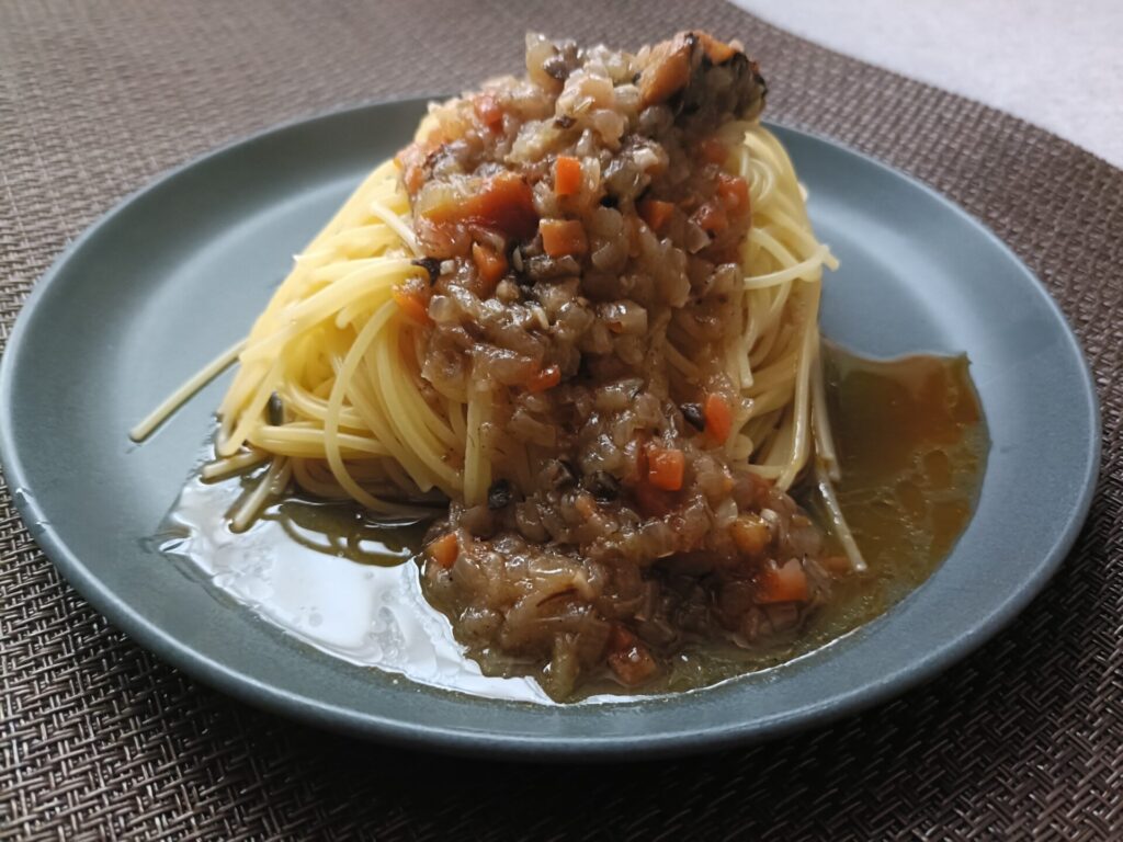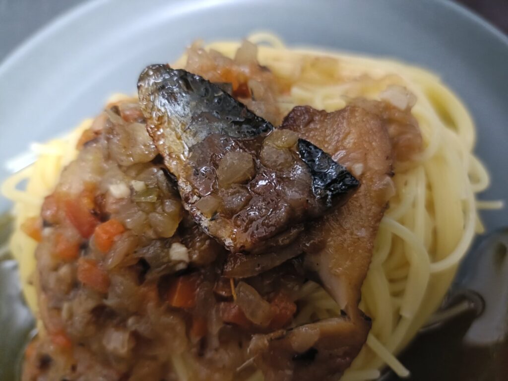 「いわしと香味野菜のペペロンチーノ」とある通り、青魚特有のあの食欲をそそる匂いです。苦手な人はちょっとびっくりするかも?でも、魚好きにはたまりません。