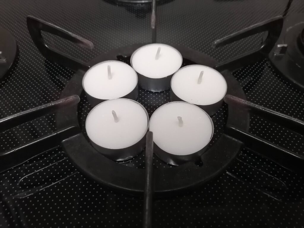 まずは五徳の中央にティーライトを5個設置します。(使用するティーライトの数が多いほど火力が上がります。)