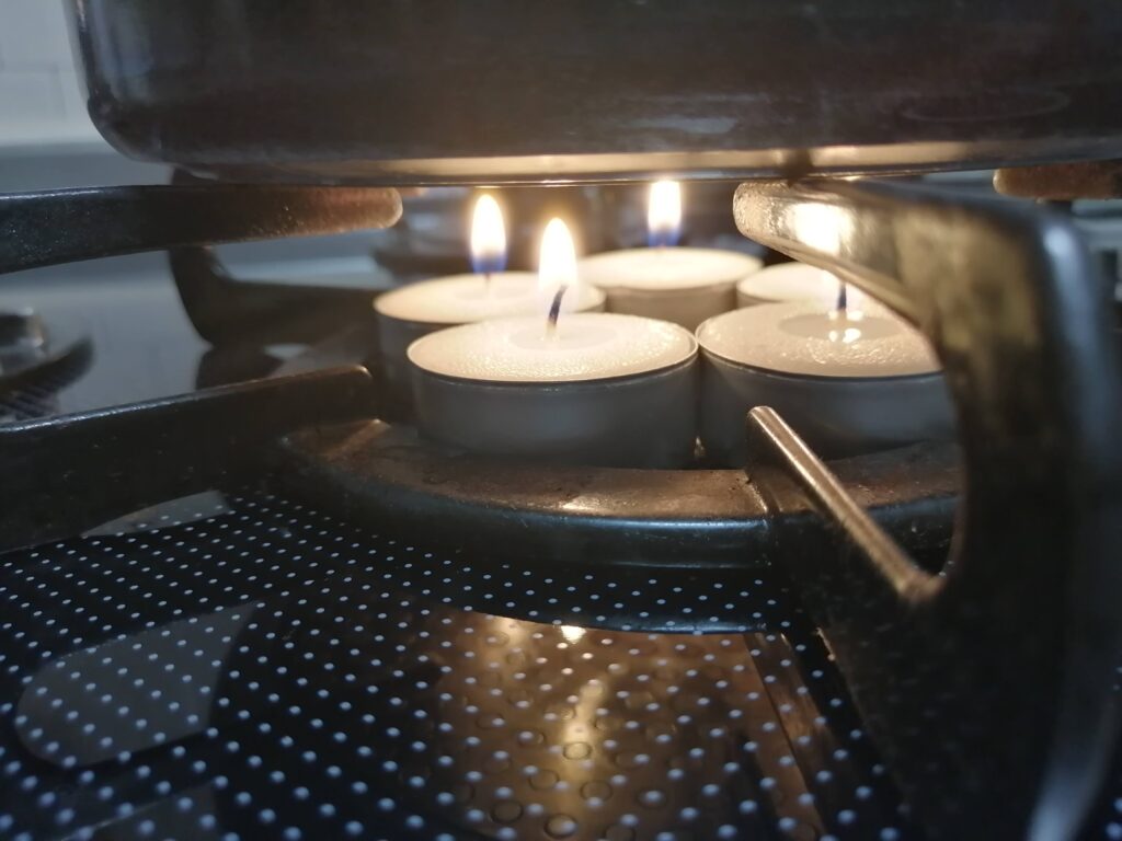 あとはティーライト全てに火をつけて上から水を入れた鍋を置くだけ。