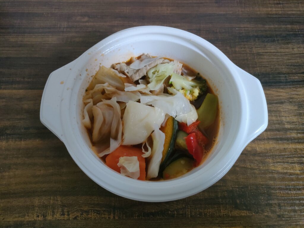具材:キャベツ、コーン、人参、かぼちゃ、ブロッコリー、ズッキーニ、じゃがいも、玉ねぎ、セロリ、ピーマン、ナス、豚肉、トマト