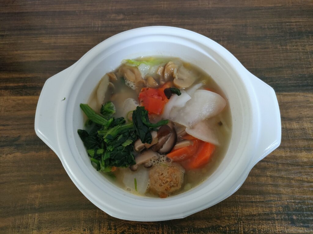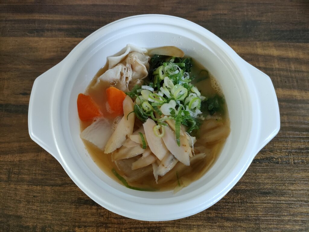 具材:チンゲン菜、玉ねぎ、ゴボウ、人参、ダイコン、かぼちゃ、インゲン、ネギ、豚肉