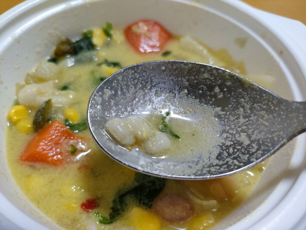 具材:コーン、人気、大根、ほうれん草、ズッキーニ、ドライトマト、白いんげん豆、エジプト豆、赤いんげん豆、いんげん豆、オルツォ(大麦)
